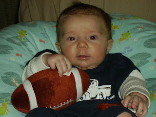 Last Wednesday, Camden had his 4 month well check-up! I KNOW, I can't BELIEVE he is already that old! My little boy is growing so quickly. He is now 15 pounds, 7 ounces (dropped from 91st percentile--when born--to the 62nd). He is not gaining as quickly as I thought he would for being so big at birth. His length is 26 and 3/4 inches (now 95th percentile from the 62nd--when born). And his head is 17.2 inches (84th percentile from the 72nd percentile) He will be a watermelon head like his father. Definitely a Romney trait.